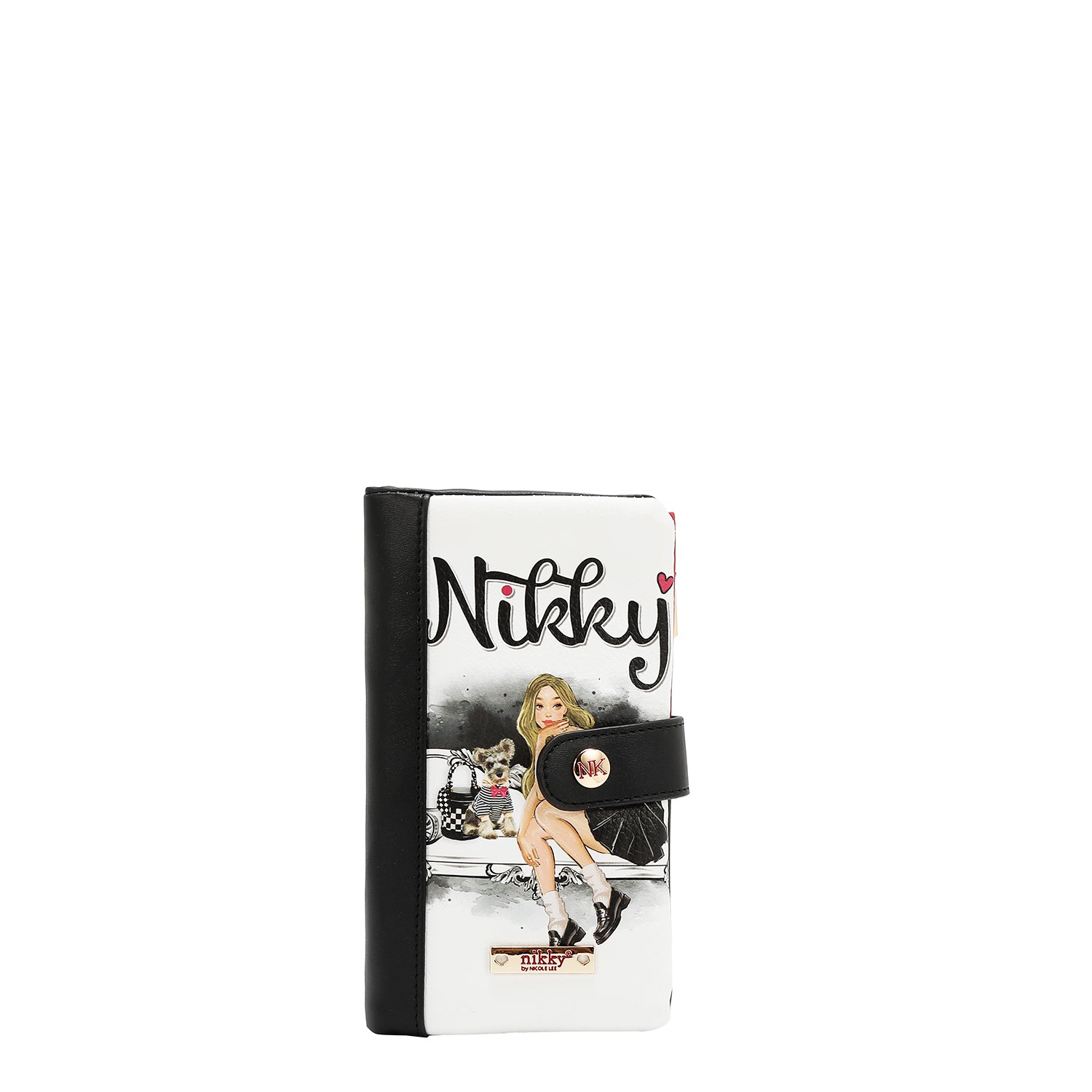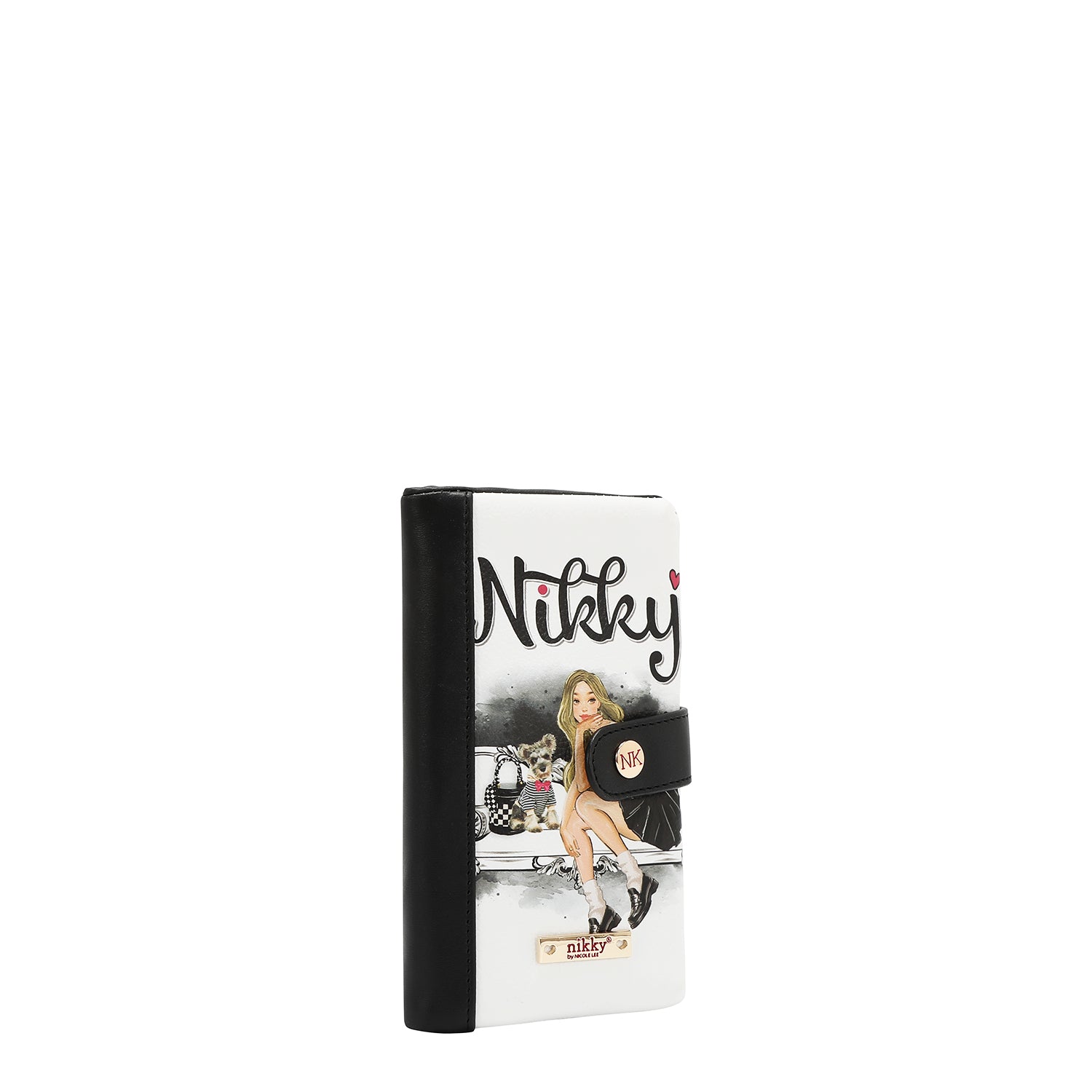 • Nikky gold-tone engraved logo nameplate at front.
